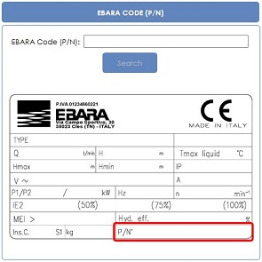 Enter the pump number in the box Ebara Code P/N to bring up your model ( full 10 digit code) or a list of models (minimum first 5 numbers). The photo above shows where on the namplate this number can be found.